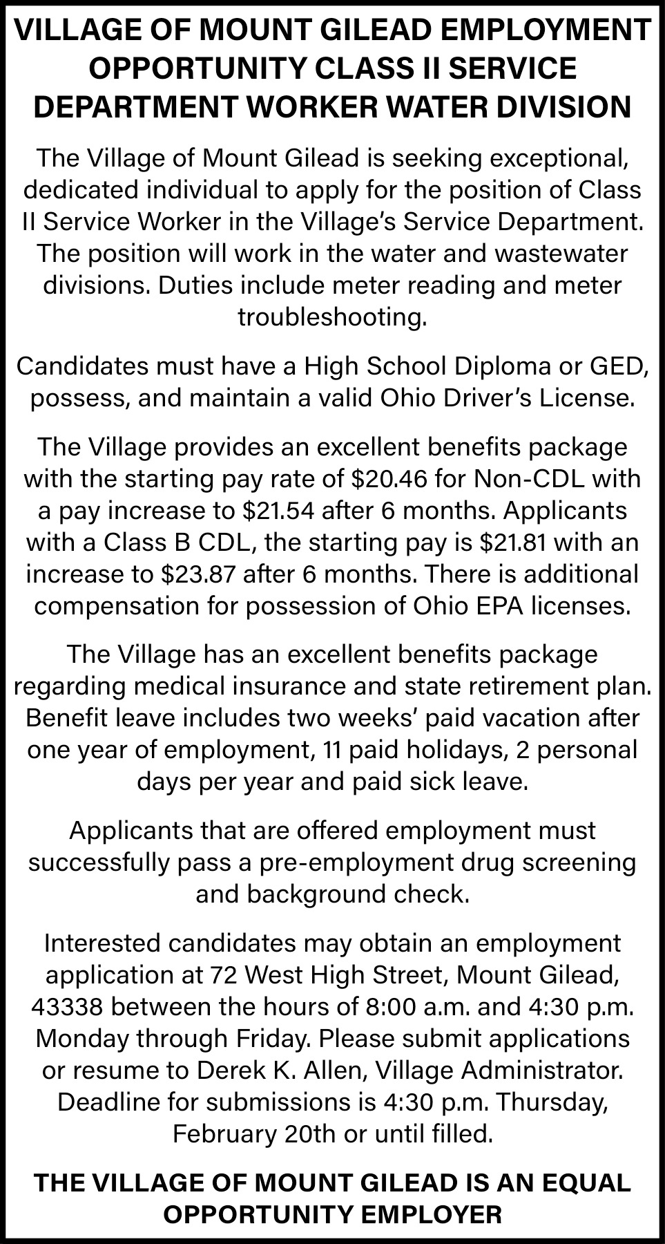 Feb 04, 2026. Village of Mount Gilead Jobs Ads from The Morrow County Sentinel
